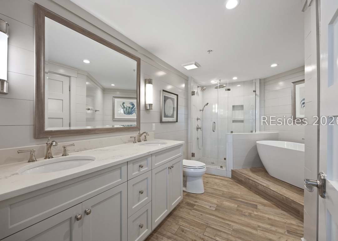 This sophisticated primary bathroom exemplifies contemporary luxury with a spa-like atmosphere, featuring a sleek marble-topped double vanity, a freestanding soaking tub, and a spacious frameless walk-in shower. The neutral palette of whites, creams, and warm wood flooring combined with crisp subway tile and chrome fixtures creates an airy, serene retreat with professional-grade finishes and thoughtful spatial planning.