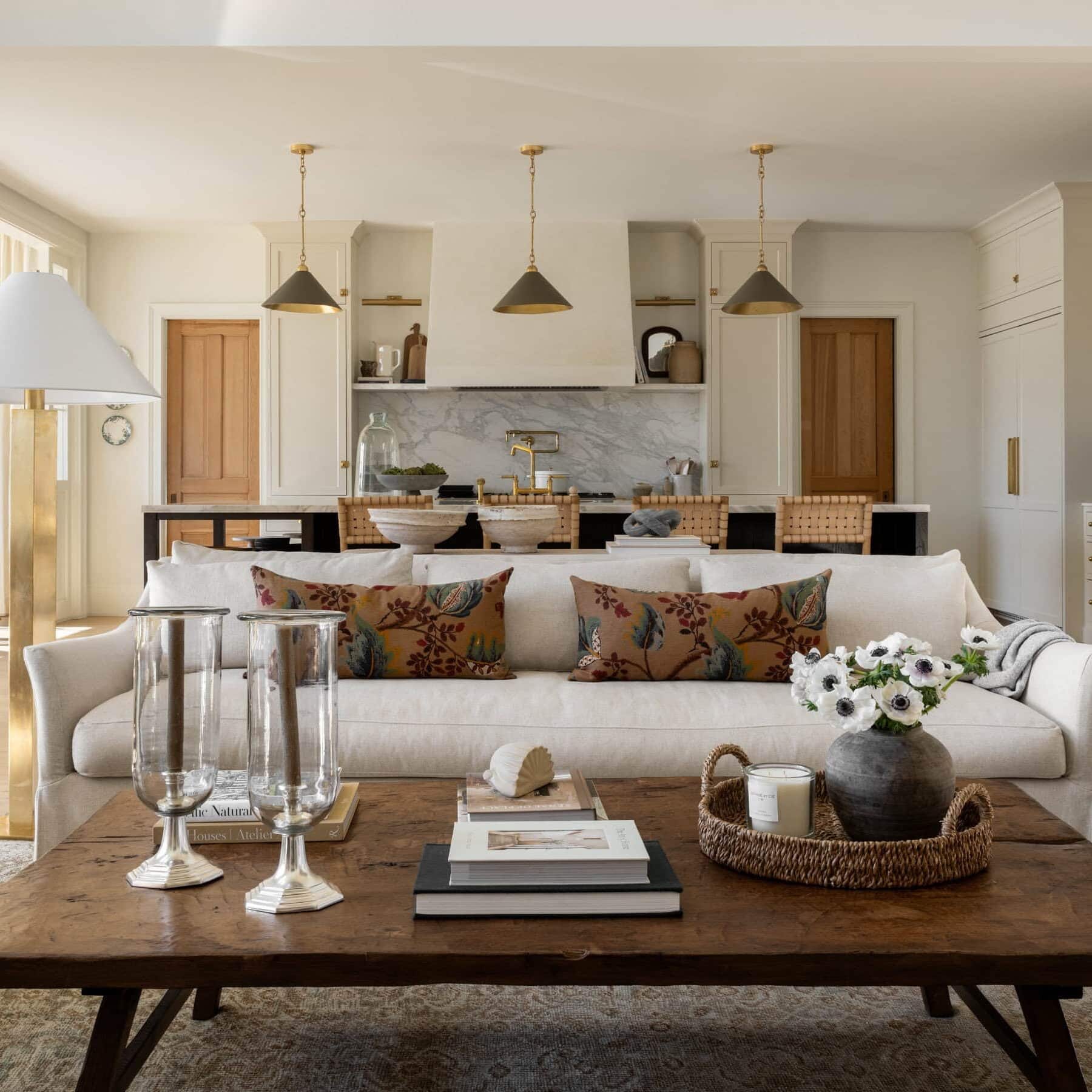 A sophisticated open-concept living room flowing into a kitchen featuring cream-toned cabinetry with marble slab backsplash and brass pendant lighting. The space balances traditional architectural details like crown molding and natural wood doors with contemporary furnishings including a neutral linen sofa styled with colorful floral pillows and a rustic wood coffee table.