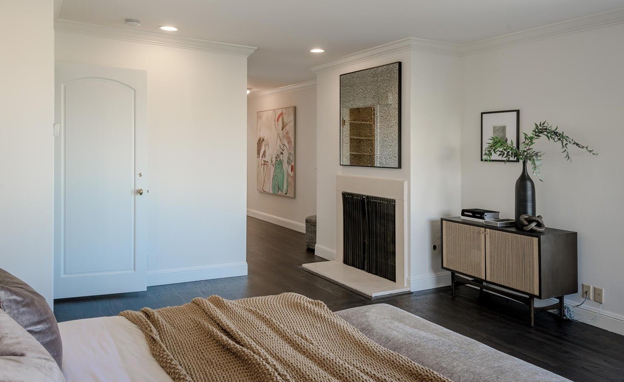 This elegant primary bedroom suite features a refined transitional design with crisp white architectural detailing, dark hardwood flooring, and a sophisticated fireplace focal point accented by curated artwork and sculptural decor. The space balances traditional molding and built-in cabinetry with clean-lined contemporary furnishings and warm natural textures, creating a serene and luxurious retreat.