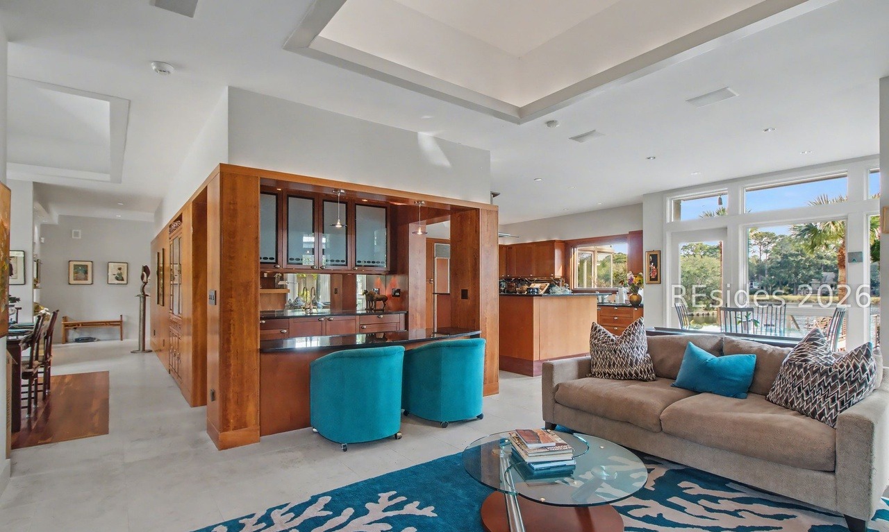 A sophisticated open-concept living and kitchen space featuring warm cognac-toned wood cabinetry paired with luxurious marble flooring and cream-painted walls. The room balances traditional transitional details like coffered ceilings with modern furnishings, highlighted by vibrant teal upholstered seating and an abstract coral-patterned area rug that add contemporary flair to this serene, light-filled sanctuary.