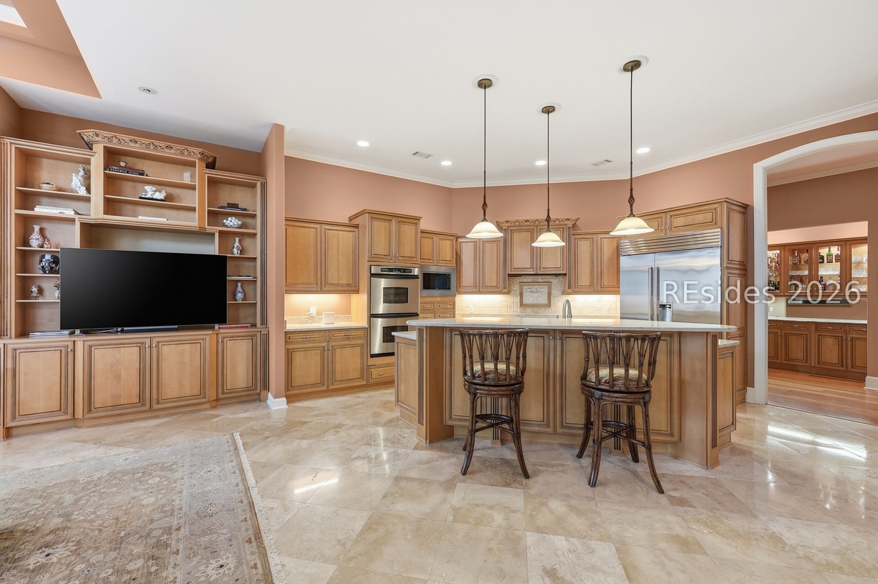 Waterfall IslandPendant LightingBuilt In ShelvingCrown MoldingHigh CeilingsOpen ConceptCustom MillworkStatement Lighting