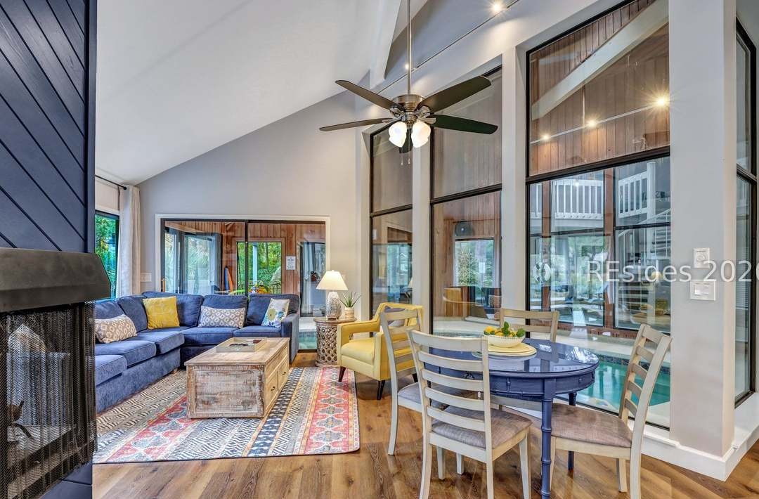 A sophisticated open-concept living and dining space featuring vaulted ceilings, abundant natural light through floor-to-ceiling windows, and a harmonious blend of traditional architectural details (crown molding, fireplace) with contemporary furnishings in a warm blue, white, and natural wood palette. The room exemplifies transitional luxury with its mix of classic proportions and modern comfort.
