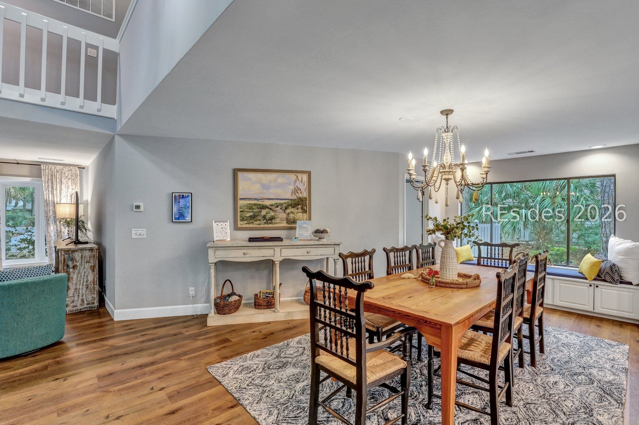 A light-filled transitional dining room seamlessly integrated into an open-concept living space, featuring a warm wood table paired with black spindle chairs and a decorative brass chandelier overhead. Floor-to-ceiling windows with tropical views, a custom built-in window seat with cushioning and storage, and soft gray walls create a sophisticated yet inviting atmosphere that balances traditional millwork with modern furnishings.