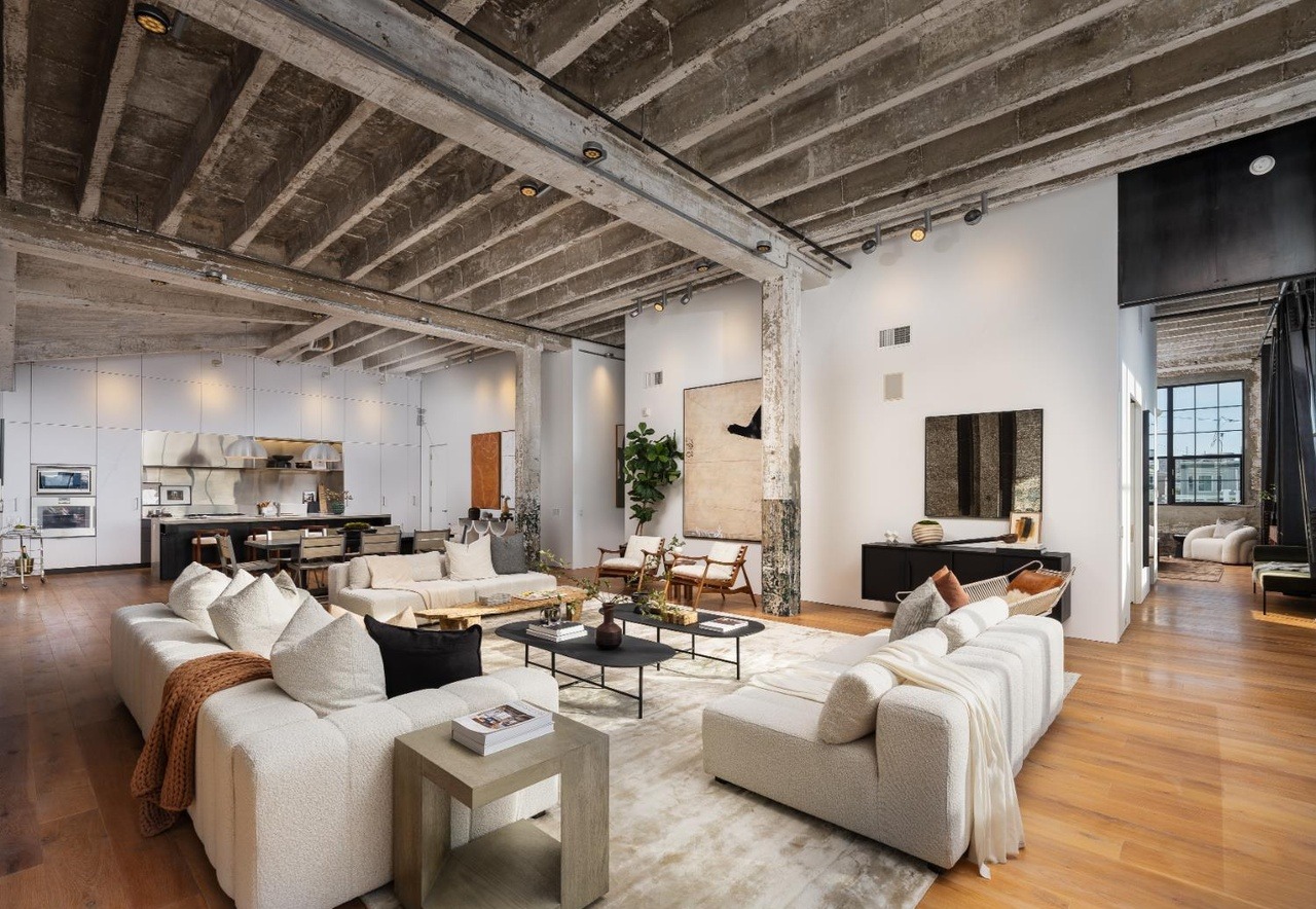 A sprawling open-concept loft living space featuring dramatic exposed concrete beams and industrial architecture softened by warm natural materials including hardwood floors, linen upholstery, and abundant natural light. The sophisticated design balances modernist architecture with organic, tactile furnishings and curated artwork, creating a serene yet grand sanctuary.