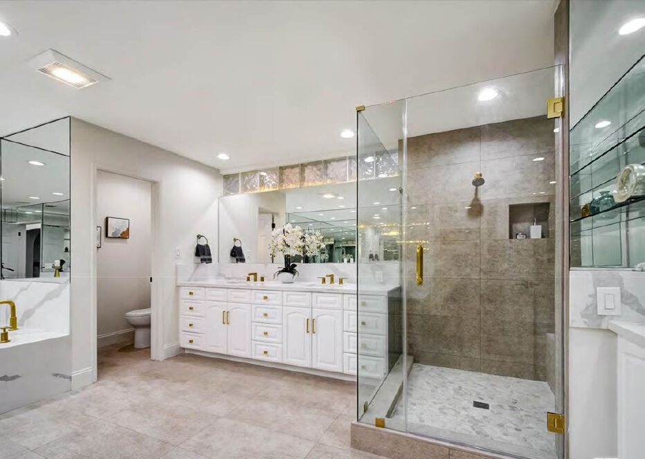 Double VanityWalk In ShowerFreestanding TubFrameless Glass Shower EnclosureCustom MillworkStatement LightingHigh CeilingsLarge MirrorsOpen Layout