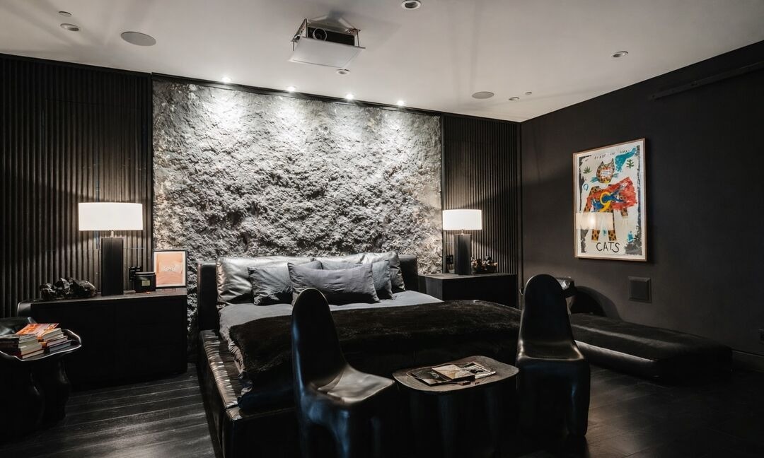 A dramatically designed primary bedroom suite featuring a striking raw stone accent wall as the centerpiece, with rich black tones, sculptural modern furnishings, and sophisticated ambient lighting throughout. The space exemplifies contemporary glam with its moody color palette, textural depth, and curated art placement for a high-impact luxury aesthetic.
