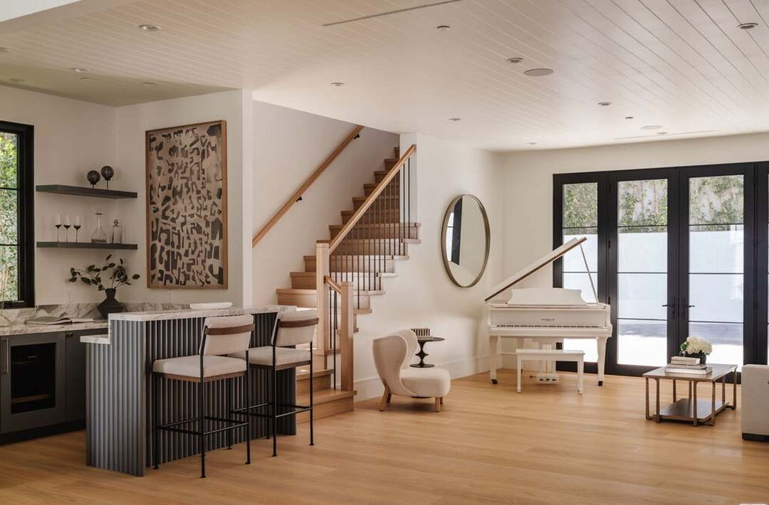 A sophisticated open-concept living space featuring a grand piano, modern wooden staircase with black metal railings, and curated furnishings in warm neutrals. The room is flooded with natural light from expansive black-framed doors and windows, balancing contemporary elegance with organic warmth through natural materials and refined minimalist styling.