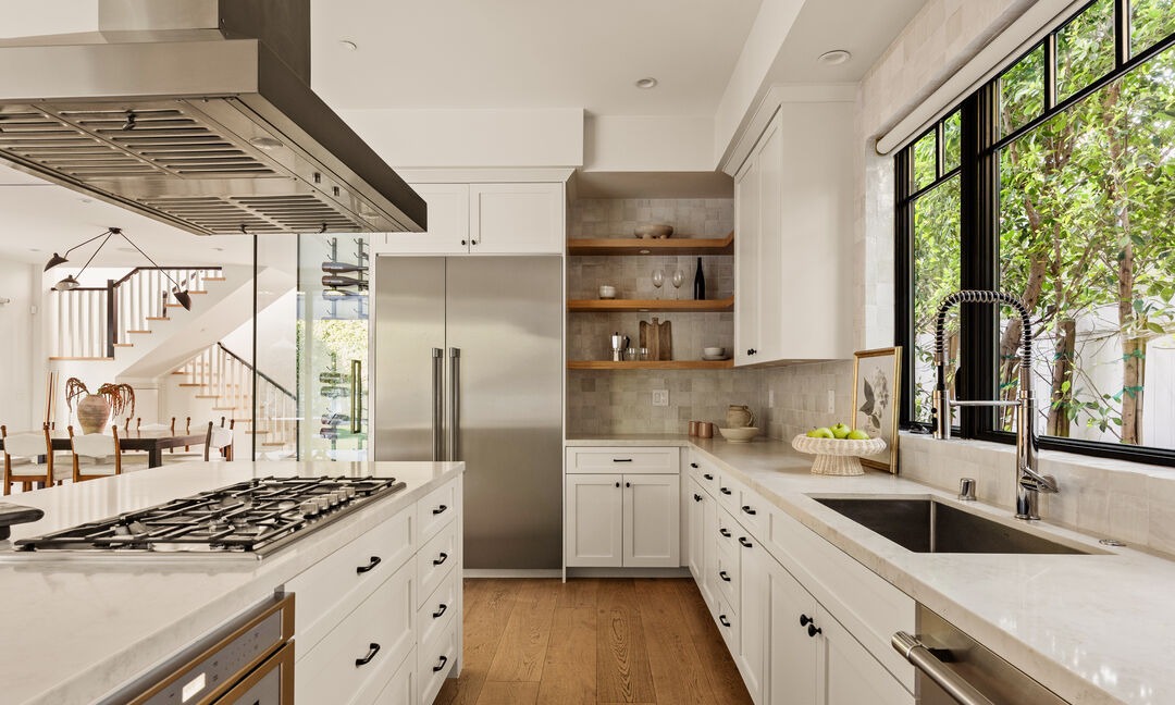 A sophisticated transitional kitchen featuring clean white cabinetry paired with warm natural wood open shelving, professional-grade stainless steel appliances, and abundant natural light from oversized windows. The design balances contemporary minimalism with organic warmth through material choices, creating an airy yet inviting luxury culinary space.