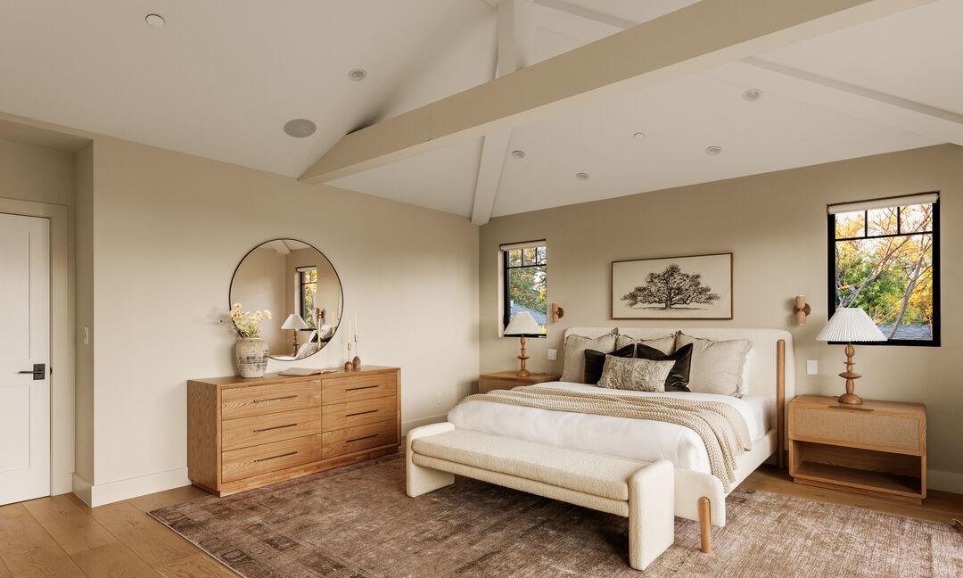 A serene primary bedroom featuring warm organic modernism with a stunning vaulted ceiling accented by white beams, oak furnishings, and an abundance of natural light from oversized windows. The palette of creams, taupes, and warm wood tones creates an elevated, restful sanctuary with sophisticated brass accents and carefully curated artwork.