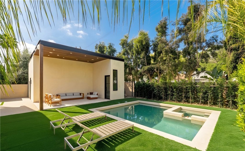 A stunning modern pool retreat with a sleek resort-style design, featuring a geometric turquoise pool with integrated spa steps, crisp white stucco pavilion with black steel framing and recessed lighting, and manicured lawn with high-end lounge furnishings. The space seamlessly blends indoor-outdoor living with sophisticated desert modern aesthetics and abundant natural light.