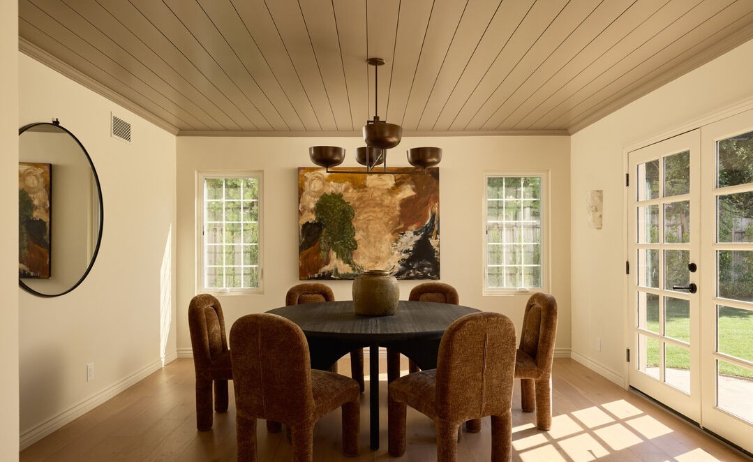 A sophisticated transitional dining room featuring a striking black round table surrounded by woven upholstered chairs, unified by a warm cream and tan palette with bronze metallic accents. Abundant natural light floods through oversized French doors and multiple windows, while a distinctive wood-planked ceiling and understated artwork create an elegant, serene atmosphere that balances contemporary simplicity with organic warmth.