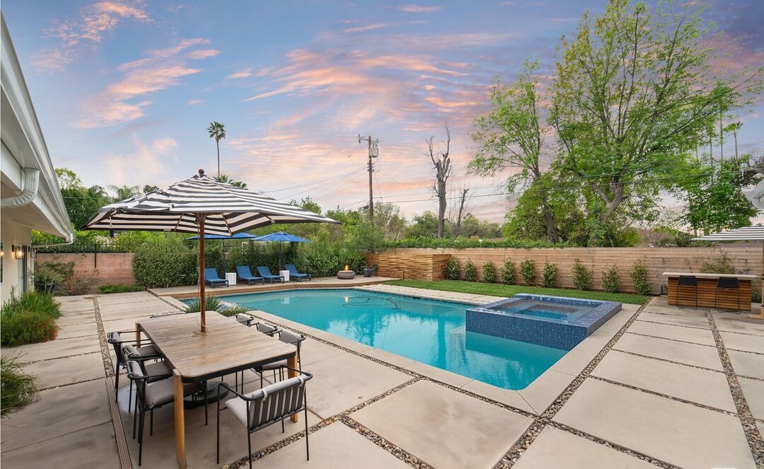 A sophisticated resort-style pool area featuring a bright turquoise swimming pool with integrated hot tub, anchored by a striped pergola umbrella and modern black lounge seating. The design seamlessly blends organic materials—concrete pavers, brick surround walls, and mature landscaping—with clean contemporary lines and professional outdoor furnishings, creating a luxurious yet approachable California modern aesthetic.