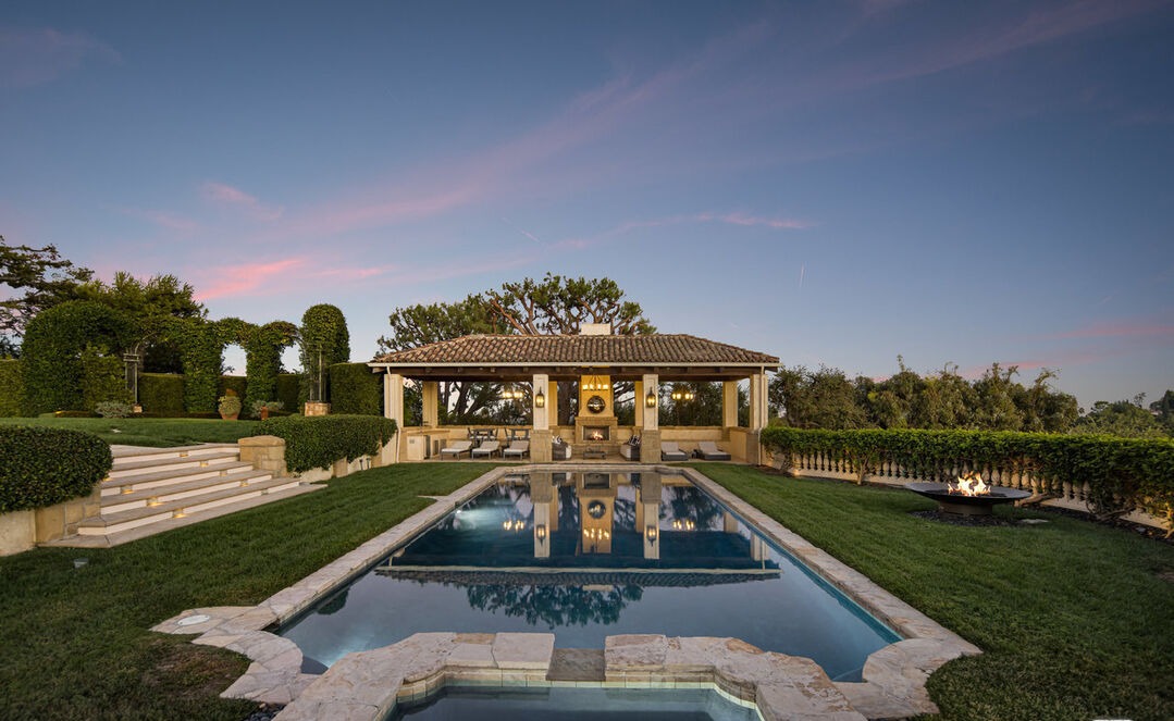 This museum-quality resort-style pool and spa complex features a sophisticated cream-colored Mediterranean pergola pavilion with barrel-tile roofing, positioned alongside an Olympic-length lap pool with deep blue water and professional lighting. The grounds showcase pristine manicured topiary, ornamental balustrading, fire pit features, and carefully composed hardscape elements that create an editorial-worthy luxury estate setting with impeccable attention to detail and timeless elegance.