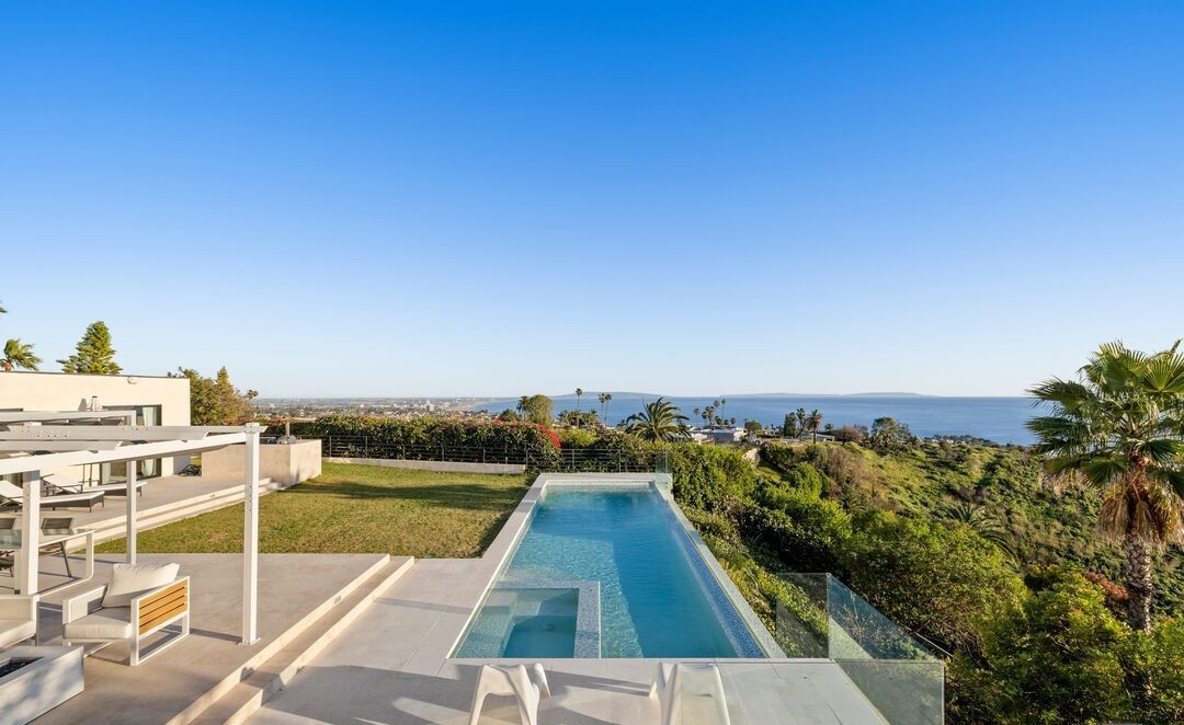 A stunning infinity-edge lap pool perfectly integrated into a contemporary hillside estate overlooking the ocean, with minimalist white modern architecture, native landscaping, and professional-grade design that exemplifies ultra-luxury California modern living. The expansive concrete deck, clean geometric forms, and seamless indoor-outdoor flow create a serene, sophisticated resort-like atmosphere.