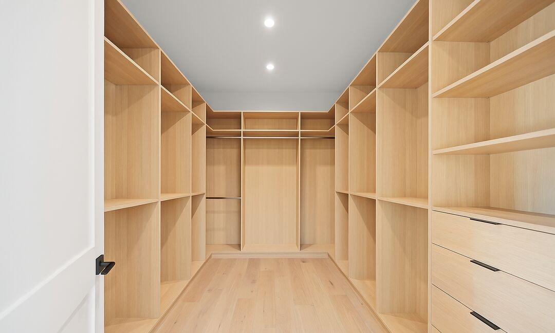A sophisticated walk-in closet featuring custom light wood shelving and built-in cabinetry with sleek black hardware, showcasing impeccable organization and minimalist design. The warm natural wood tones paired with crisp white walls and hardwood flooring create a serene, gallery-like dressing space with carefully proportioned storage solutions.