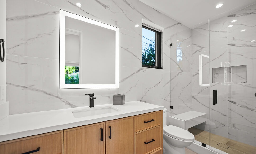 A sophisticated primary bathroom featuring a warm wood floating vanity with quartz countertop contrasted against cool Calacatta-style marble large-format tile walls, completed by a frameless glass walk-in shower and lighted mirror. The design balances organic warmth with contemporary minimalism, creating an airy, spa-like sanctuary with abundant natural light from the operable window.