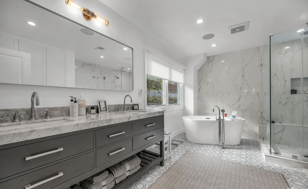 A stunning primary bathroom featuring a spa-like design with sophisticated two-tone cabinetry, Italian marble surfaces, and a striking freestanding soaking tub positioned as a focal point. The marble-clad walk-in shower with frameless glass enclosure, hexagonal floor tile detailing, and abundant natural light create a serene, high-end retreat that balances contemporary clean lines with warm brass accents and organic materiality.