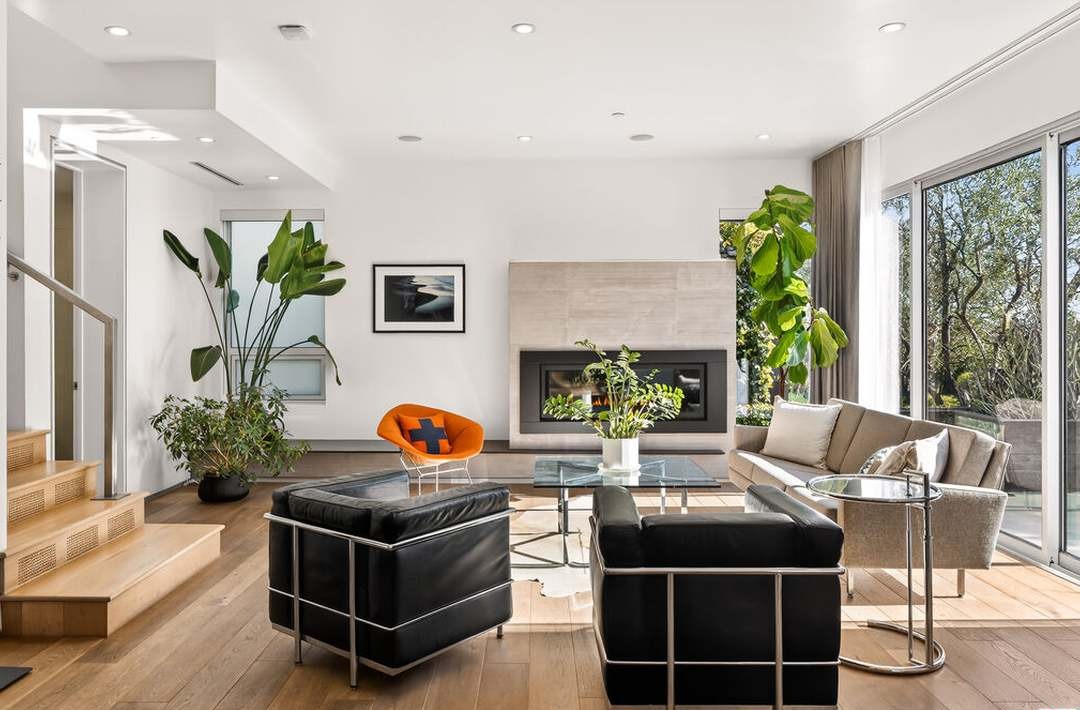 A stunning open-concept living room featuring warm hardwood floors, floor-to-ceiling windows with abundant natural light, and a sophisticated fireplace with light wood surround and black insert. The space elegantly blends modern furnishings—including iconic mid-century lounge chairs and clean-lined black leather seating—with organic warmth through lush greenery, curated artwork, and a neutral palette punctuated by an eye-catching orange accent chair.