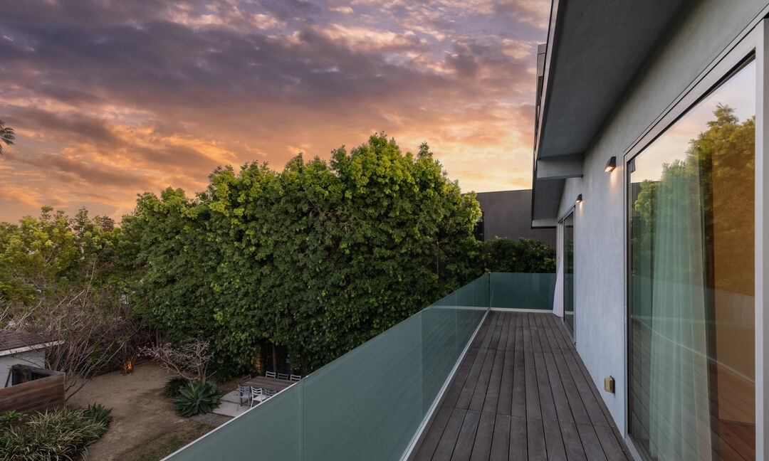 A sophisticated modern patio with seamless indoor-outdoor integration, featuring a composite deck, frameless glass railing system, and dramatic golden-hour sunset views overlooking mature landscape vegetation. The minimalist design emphasizes clean lines and a neutral palette, creating an airy retreat enhanced by professional architectural lighting.