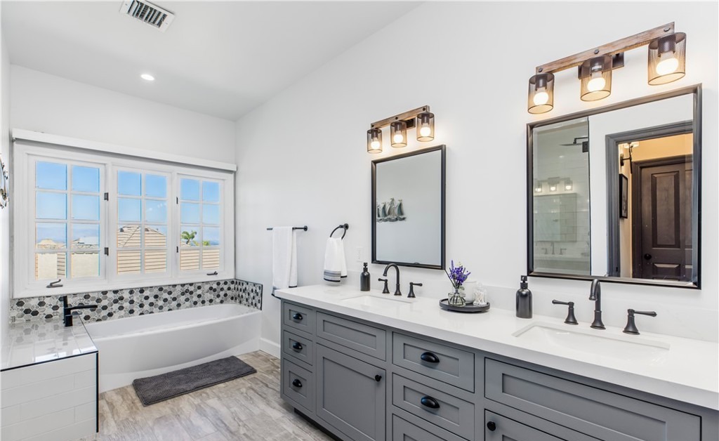 Countertop: QuartzCabinets: Flat PanelCabinet Color: GrayFlooring: TileCeiling: StandardVanity: Double SinkShower: Frameless GlassTub: Built InTile: Penny Round
