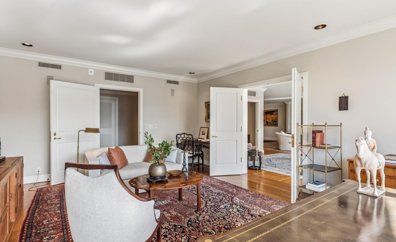An elegant primary suite featuring a sophisticated transitional design that blends traditional architectural details like crown molding and custom millwork with clean-lined modern furnishings and a warm, neutral palette. The space seamlessly connects the bedroom, sitting area, and ensuite bathroom through flowing open-concept design, anchored by quality hardwood flooring and punctuated with curated decorative objects and layered textures in terracotta and bronze tones.