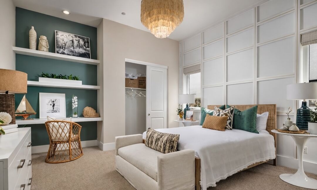A sophisticated primary bedroom masterfully blending transitional design with organic modern warmth, featuring a striking teal accent wall with floating white shelving, natural woven textures, and brass-accented statement lighting above a layered bed dressed in soft linens and textured pillows. The space balances cool accent colors with warm neutrals and natural materials to create a serene, collected-yet-curated sanctuary.