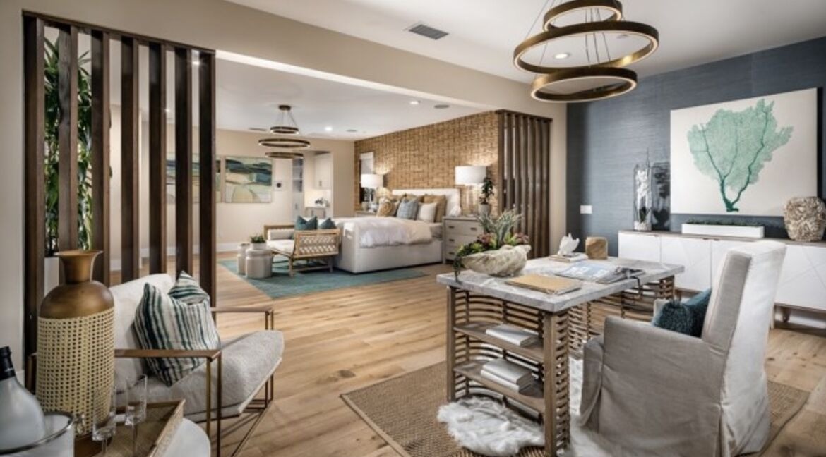 A sophisticated primary bedroom suite that seamlessly blends organic modern and transitional design, featuring warm hardwood flooring, soft neutral palette with sage and teal accents, and a striking brick accent wall anchoring the sleeping area. The open layout incorporates a luxurious sitting area with brass-accented statement lighting and carefully curated furnishings that emphasize comfort and elegance.