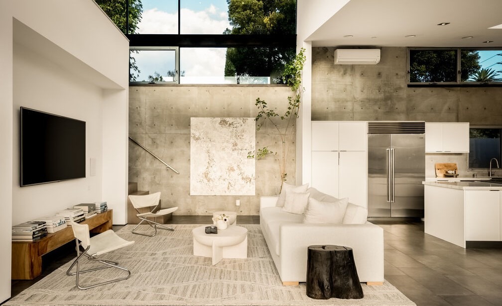 A sophisticated open-concept living space defined by minimalist design and abundant natural light, featuring raw concrete accent walls that frame a gallery-style artwork, paired with clean-lined white furniture and integrated stainless-steel kitchen cabinetry. The design balances industrial rawness with refined simplicity, creating an urban luxury aesthetic with dramatic vertical elements and curated contemporary furnishings.