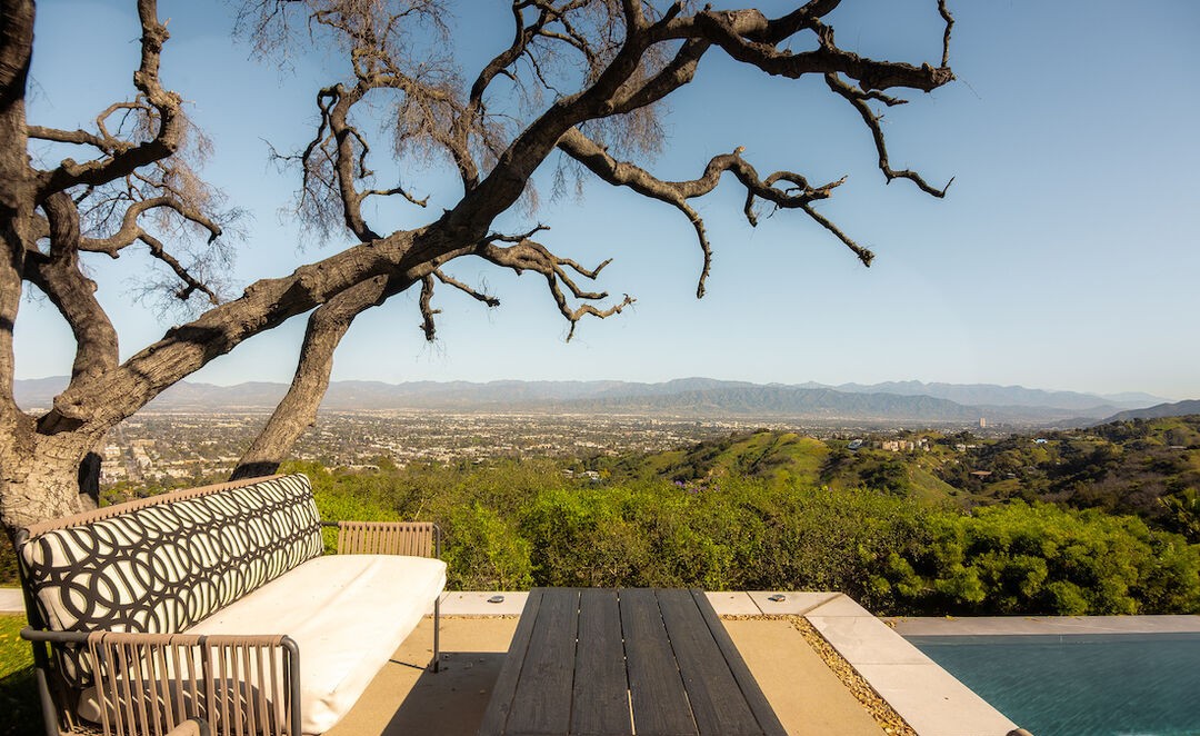 A breathtaking hilltop pool terrace in desert modern style, featuring an infinity pool that seems to merge with the expansive valley landscape below. The dramatic gnarled tree provides sculptural framing and natural shade over minimalist black and cream lounge seating, while warm-toned stone decking and woven accent pieces create an elevated yet organic aesthetic that celebrates both contemporary design and the raw beauty of the surrounding desert terrain.