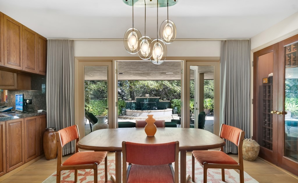 A sophisticated mid-century modern dining room featuring a striking oval walnut table with warm rust and burnt sienna upholstered chairs, anchored by a sculptural brass multi-pendant fixture. Floor-to-ceiling glass doors flood the space with natural light, connecting it seamlessly to a serene exterior garden lounge area, while warm wood tones and carefully curated mid-century furnishings create an inviting yet elevated aesthetic.