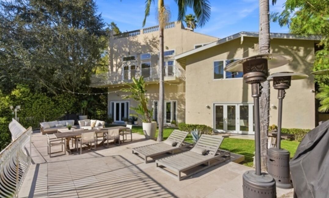 An expansive poolside patio featuring a sophisticated blend of neutral tones, premium lounge seating, and elegant bronze heaters integrated into a meticulously landscaped outdoor living space. The refined coastal aesthetic combines natural materials, clean lines, and abundant natural light to create a serene resort-style retreat attached to a substantial contemporary residence.