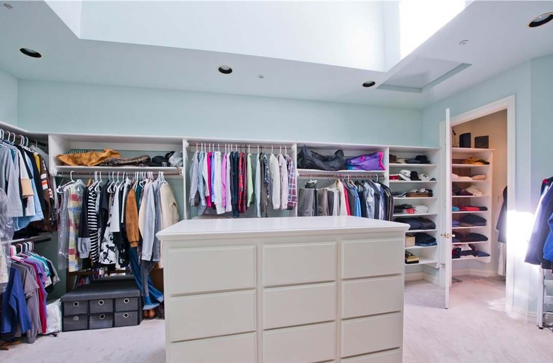 A stunning walk-in closet featuring a pristine white center island with drawers, extensive custom built-in shelving, and abundant natural light from a central skylight. The room exemplifies high-end closet design with meticulous organization, soft blue-gray wall tones, and premium finishes throughout, creating a spa-like luxury dressing environment.