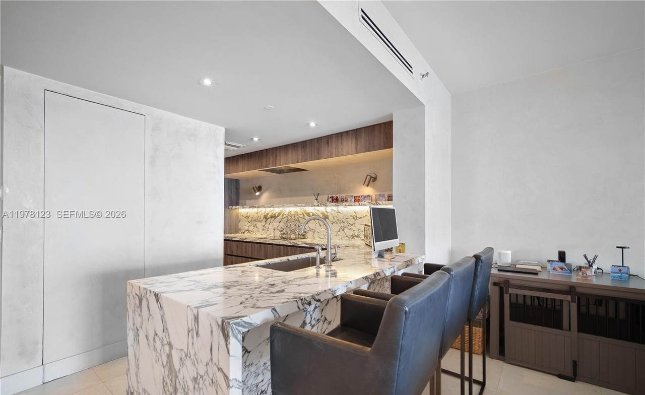 A stunning ultra-luxury kitchen featuring a dramatic waterfall marble island with integrated seating, paired with sleek white flat-panel cabinetry, warm wood accent paneling, and elegant brass hardware. The sophisticated palette of white, cream, and warm wood tones is elevated by professional under-cabinet lighting and an open-concept layout that seamlessly connects the cooking space to the adjacent home office area.
