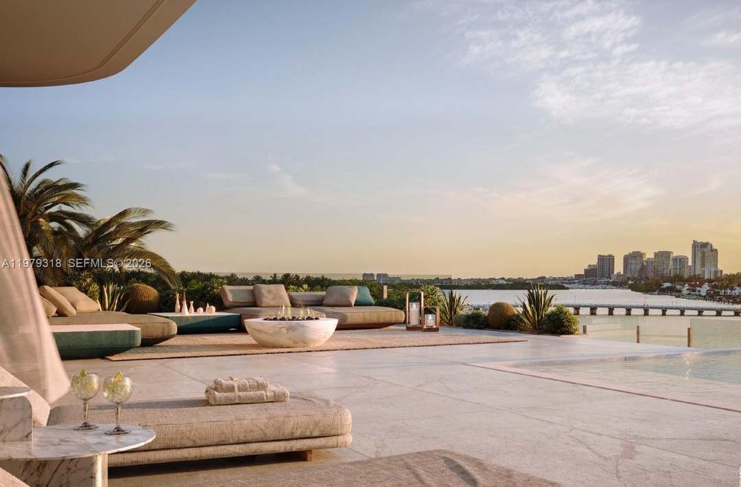 A stunning contemporary waterfront patio featuring organic modern design with warm neutral tones, linen upholstered seating, and a sculptural fire pit overlooking a bay with dramatic city skyline views. The space exemplifies luxury outdoor living with its seamless indoor-outdoor flow, natural material palette, and editorial-quality design composition.