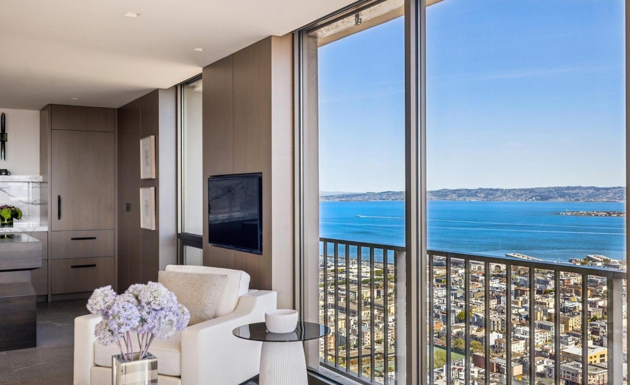 This ultra-luxury coastal living room showcases floor-to-ceiling oceanfront views with a sophisticated palette of cream, taupe, and soft blue tones. The thoughtfully composed space combines organic materials, clean modern lines, and premium finishes while maintaining an airy, serene atmosphere elevated by professional photography and designer-level attention to detail.