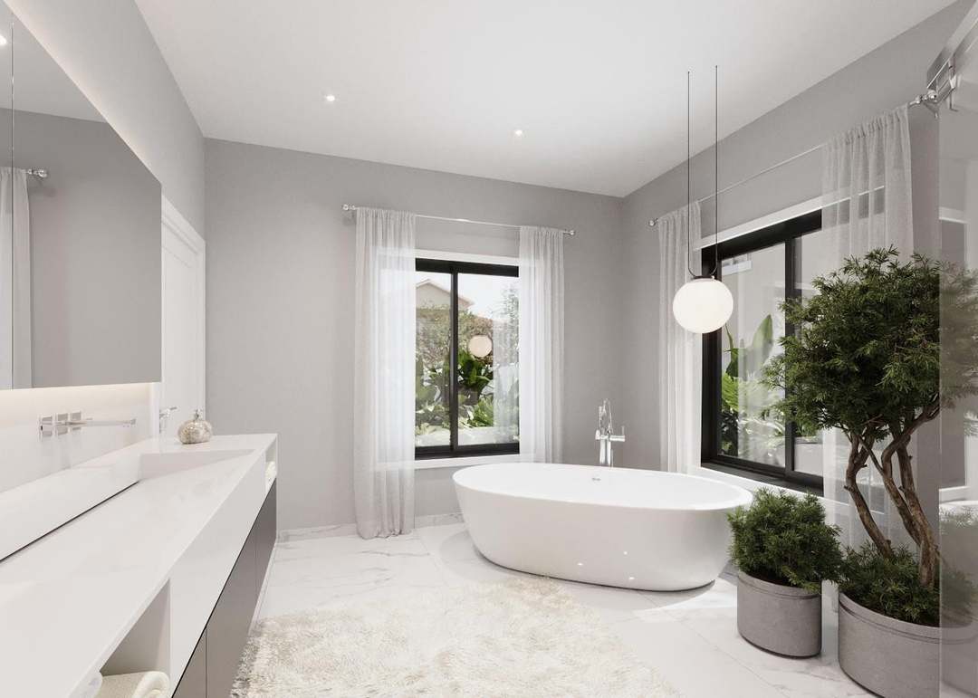 A spa-like primary bathroom featuring a sculptural freestanding soaking tub as the focal point, complemented by a minimalist white floating double vanity and frameless glass shower enclosure. The serene palette of soft grays, whites, and marble surfaces is enriched by lush greenery and abundant natural light from large black-framed windows, creating a tranquil, resort-quality retreat.