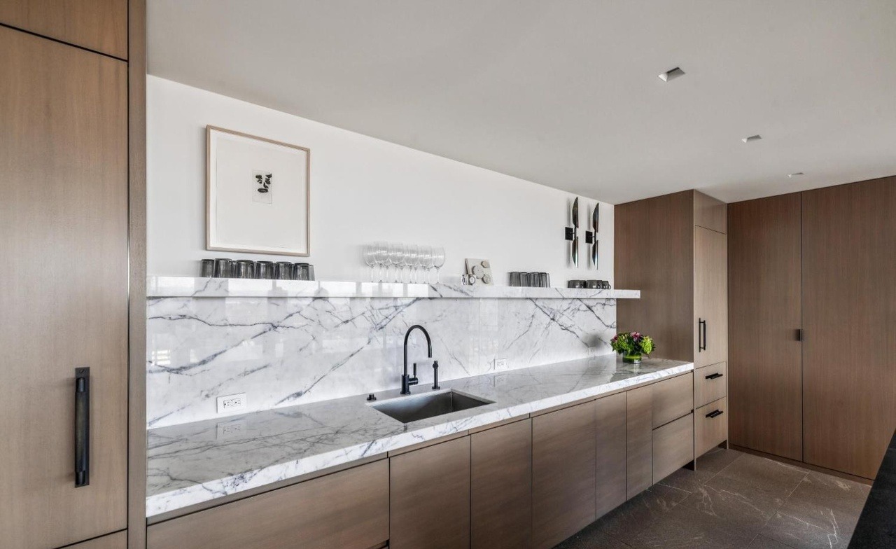 Countertop: MarbleCabinets: Flat PanelCabinet Color: Light WoodFlooring: Dark StoneBacksplash: Marble SlabCeiling: Standard