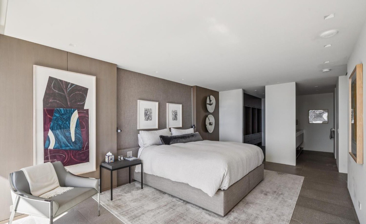 A sophisticated primary bedroom suite featuring warm taupe textured walls, contemporary white millwork, and a curated art collection that adds personality without clutter. The room balances organic warmth with clean modern lines through layered materials—hardwood flooring, linen upholstery, and natural wood accents—creating a serene yet luxurious retreat with professional gallery-style lighting and contemporary furnishings.