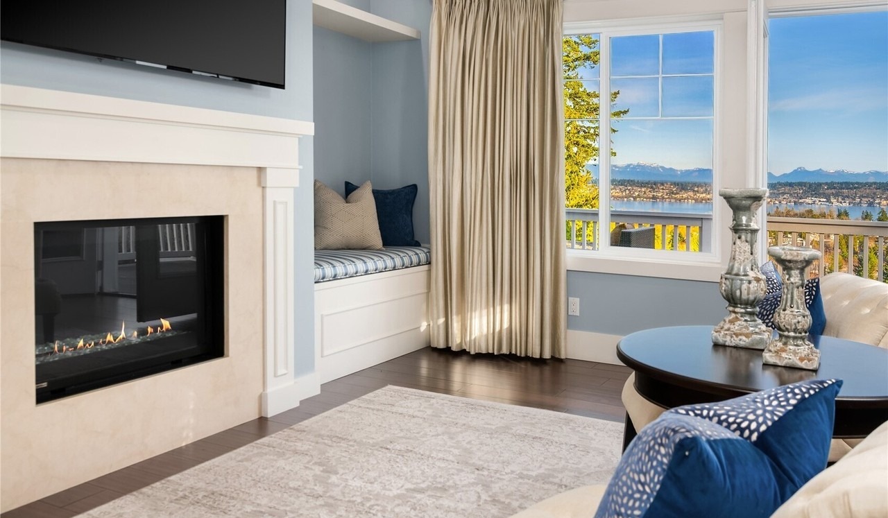A stunning family room featuring floor-to-ceiling windows with expansive mountain and waterfront views, anchored by a contemporary linear fireplace and a sophisticated window seat with navy striped cushions. The refined palette of whites, creams, and blues is elevated by custom millwork, dark hardwood flooring, and ornamental stone urns, creating a serene yet luxurious space that seamlessly blends traditional architectural details with modern comfort.