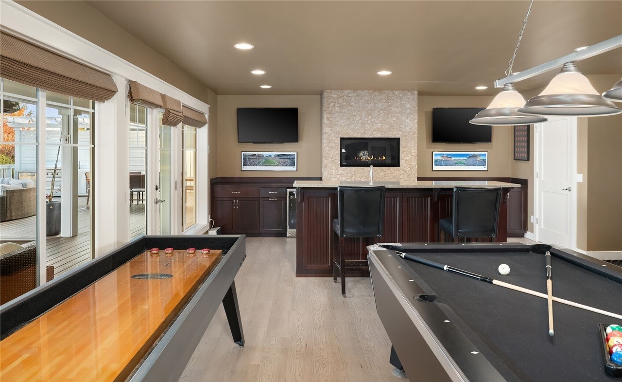 FireplaceBuilt In ShelvingCrown MoldingRecessed LightingStatement LightingHigh CeilingsFloor To Ceiling WindowsPool TableShuffleboard TableBar Counter