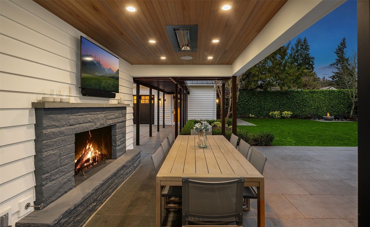 A sophisticated covered outdoor kitchen and dining space seamlessly integrating a stone fireplace, pergola structure, and natural landscape views. The design balances modern functionality with warm natural materials—concrete counters, wood-plank ceiling, and stone accents—creating an elegant entertainment area that extends the luxury home's living spaces into the landscape.