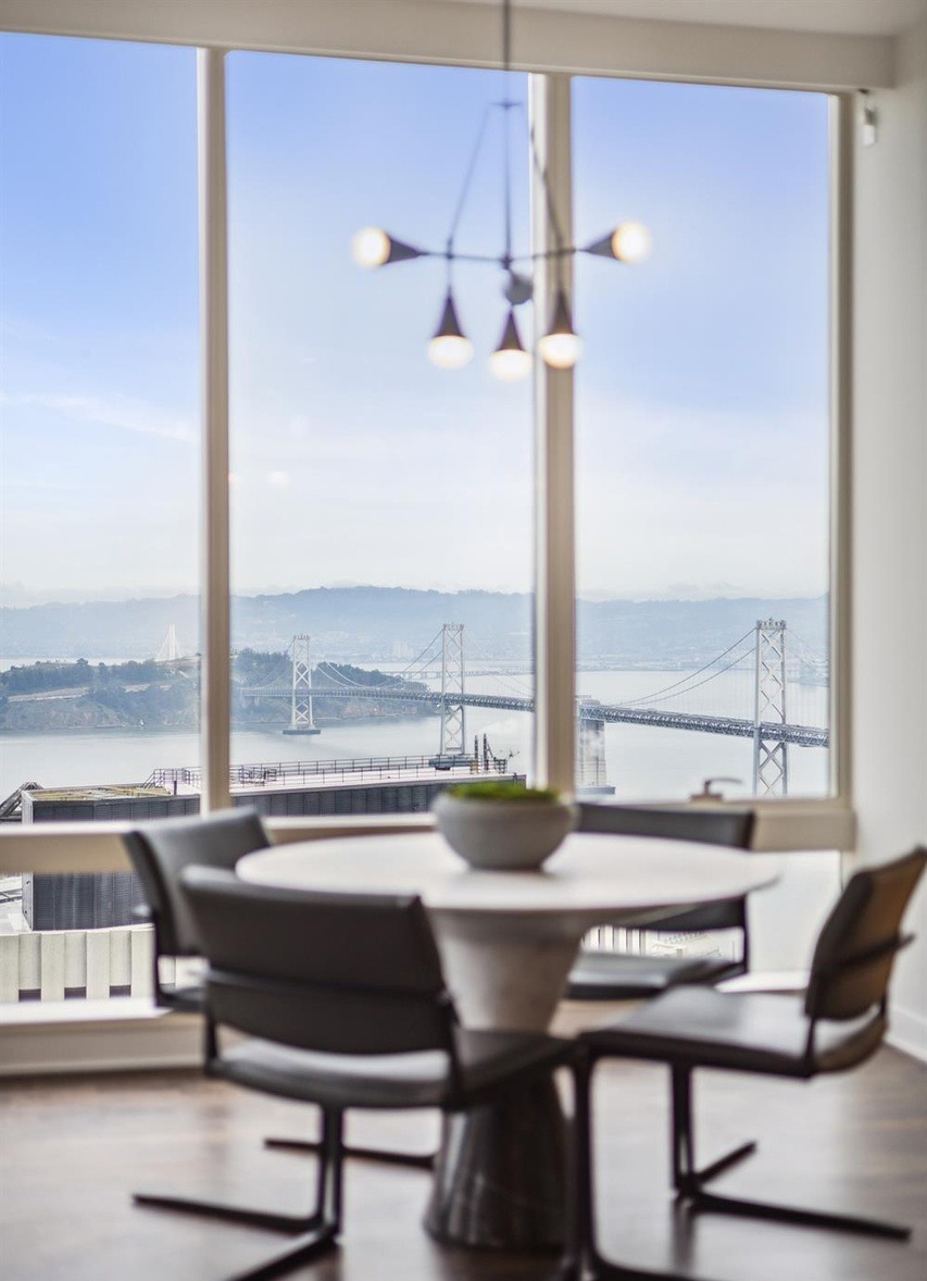 A breathtaking modern dining room with floor-to-ceiling windows framing iconic Bay Bridge views and San Francisco skyline, featuring a minimalist white round table, sculptural black mid-century chairs, and an artistic brass multi-pendant chandelier that anchors the serene, light-filled space with understated elegance and architectural drama.