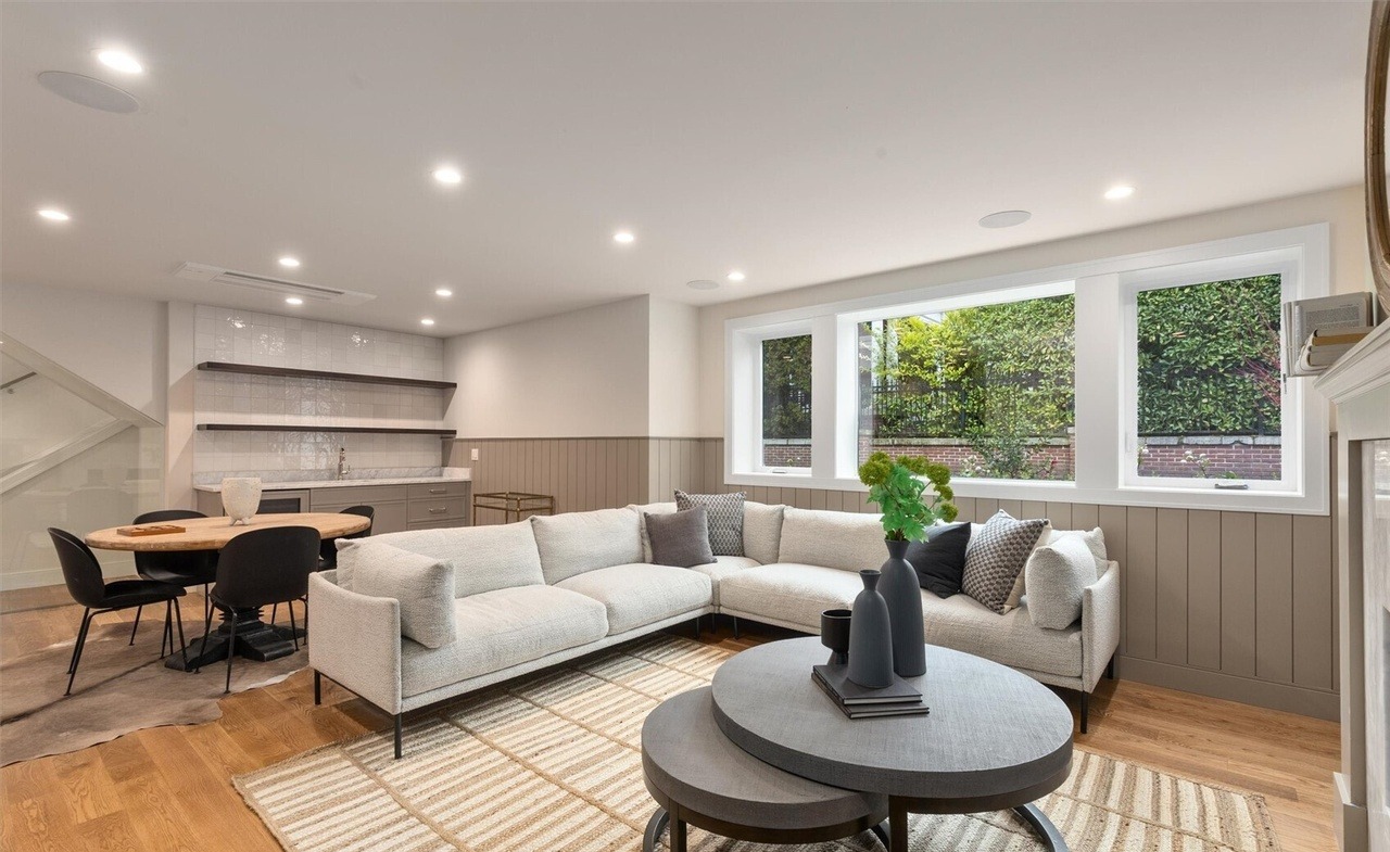 A sophisticated open-concept family room combining transitional and organic modern design with board-and-batten wainscoting, abundant natural light from oversized windows, and a neutral palette of whites, grays, and warm wood tones. The space features a custom L-shaped sectional, oval coffee table, and integrated wet bar, exuding relaxed luxury with clean-lined furnishings and understated elegance.