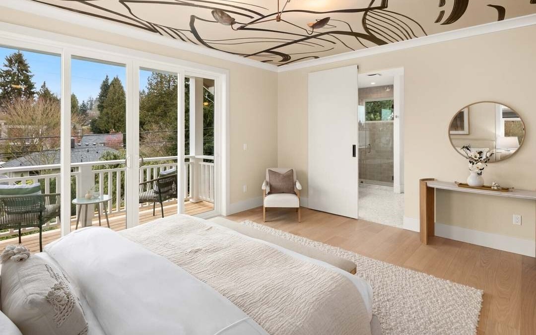 A serene primary bedroom suite featuring abundant natural light from floor-to-ceiling windows and a private balcony, with a sophisticated palette of warm creams and soft neutrals anchored by warm hardwood flooring. The custom ceiling art installation and seamless integration with an en-suite bathroom create a luxurious, spa-like retreat with organic modern design sensibilities.