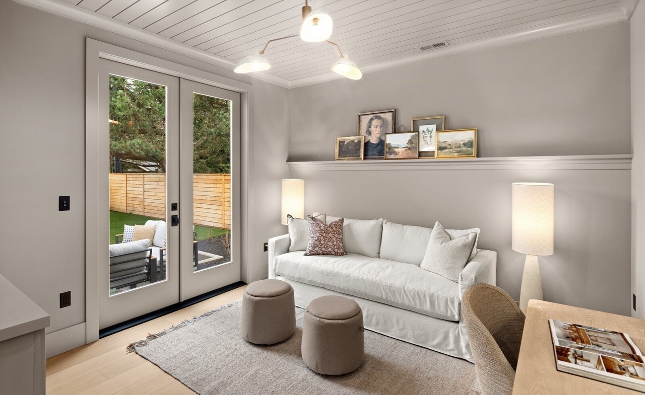 A serene, light-filled family room featuring organic modern design with clean-lined furnishings in soft neutrals, anchored by abundant natural light through floor-to-ceiling glass doors opening to a manicured garden. The space combines transitional architecture—shiplap ceiling, wainscoting, and crown molding—with contemporary furniture and brass pendant lighting for a sophisticated, understated luxury aesthetic.