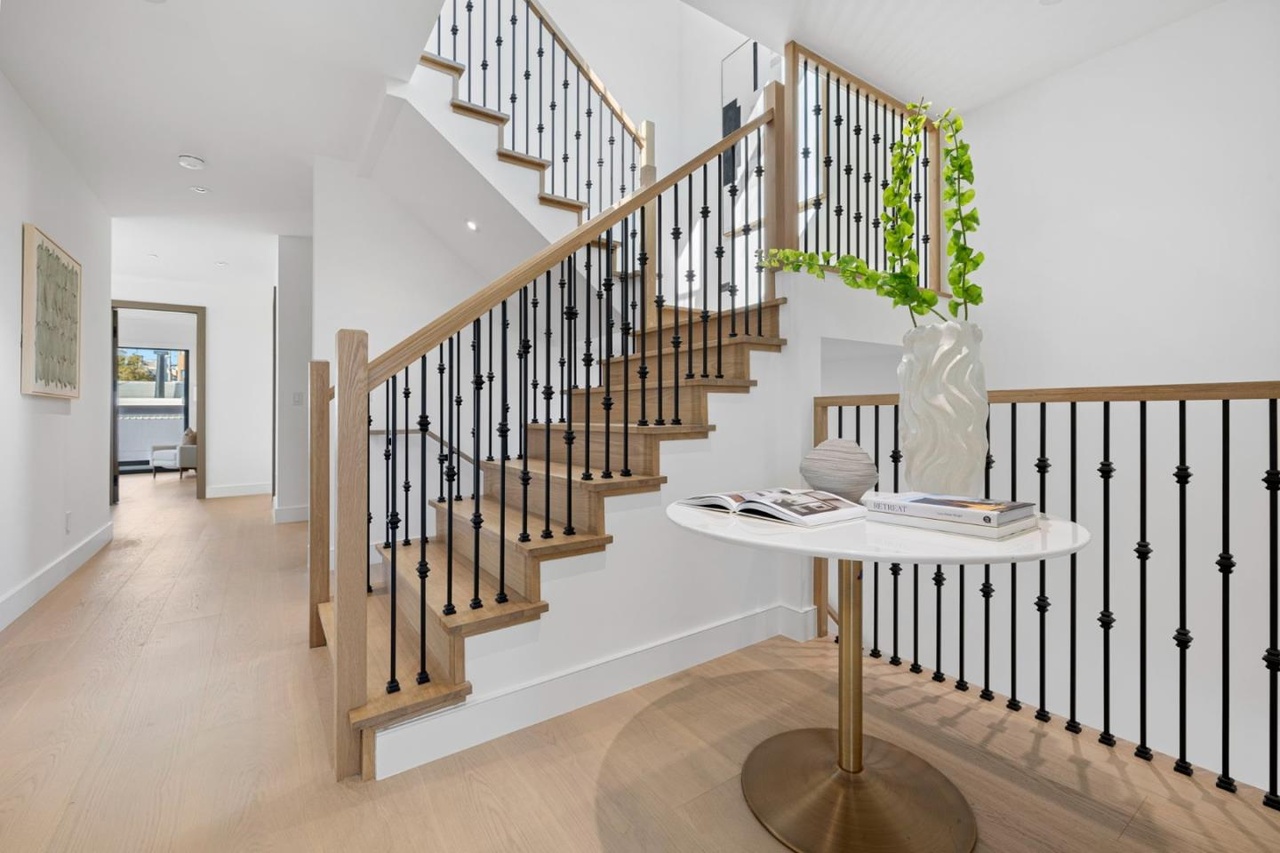 A striking modern staircase with natural oak handrails and black metal spindles, anchored by a sculptural round side table with decorative accents. The bright, airy space features white walls, abundant natural light, and refined details like crown molding and wainscoting, creating a sophisticated transitional aesthetic that feels both timeless and contemporary.