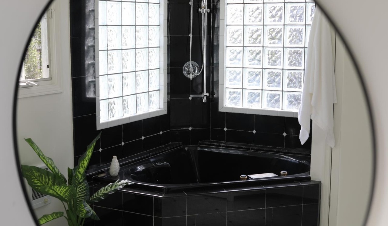 A striking primary bathroom featuring a luxurious freestanding soaking tub positioned as the focal point, paired with a sleek frameless glass walk-in shower, both surrounded by dramatic large-format black tile with silver grout accents. The space exudes high-end glamour through its monochromatic palette, abundant natural light from dual windows with decorative patterned glass, and polished chrome fixtures that create a sophisticated, gallery-like atmosphere.