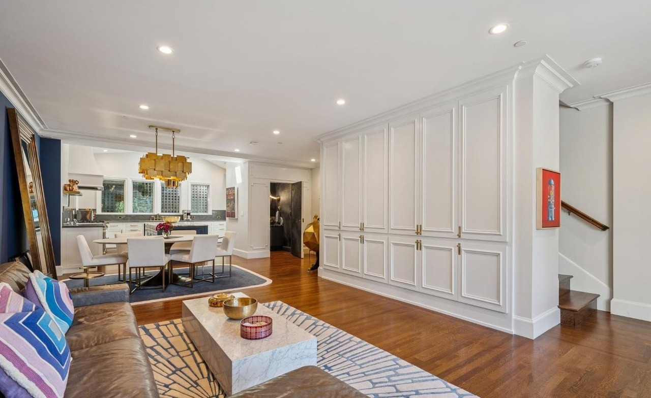 A sophisticated open-concept living and dining space featuring elegant transitional design with classic Hamptons-inspired details including white paneled millwork, navy blue accents, and brass fixtures. The room balances traditional architectural elements like crown molding and wainscoting with contemporary furnishings and abundant natural light, creating a serene yet refined atmosphere.