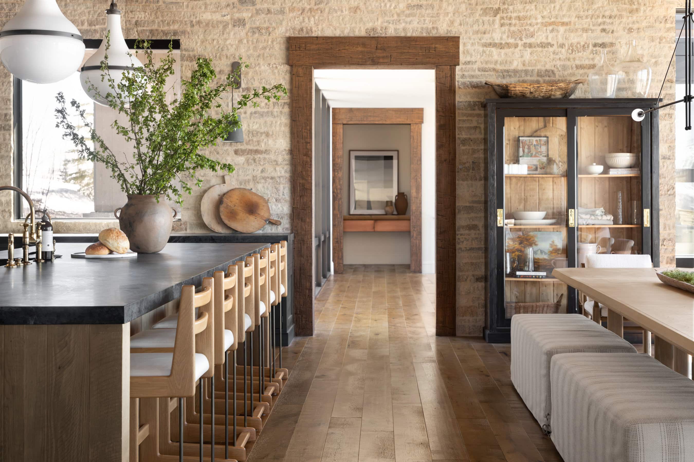 A sophisticated organic modern kitchen featuring a dramatic exposed brick wall backdrop, concrete waterfall island countertop, and warm natural wood cabinetry with brass hardware. The space balances industrial materials with warm, inviting details—potted greenery, ceramic vessels, and flowing sightlines through glass-fronted display cabinetry—creating an airy yet grounded aesthetic.