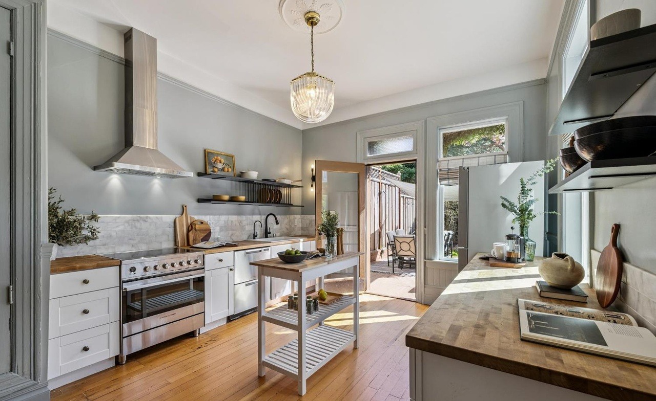 A bright, sophisticated kitchen featuring clean-lined white Shaker cabinetry paired with warm walnut wood counters and marble subway tile backsplash, anchored by a functional island with open shelving. The space exemplifies transitional design with its modern sensibilities (brass hardware, minimalist fixture choices, open concept flow) balanced by traditional architectural details (crown molding, wainscoting), flooded with natural light from expansive windows overlooking an outdoor patio.